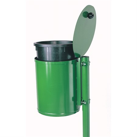 KSAB Papperskorg inkl plasthink. Finns i svart eller grönt som lagervara, men i större kvantiteter (>10) kan de fås i valfri RAL-färg.